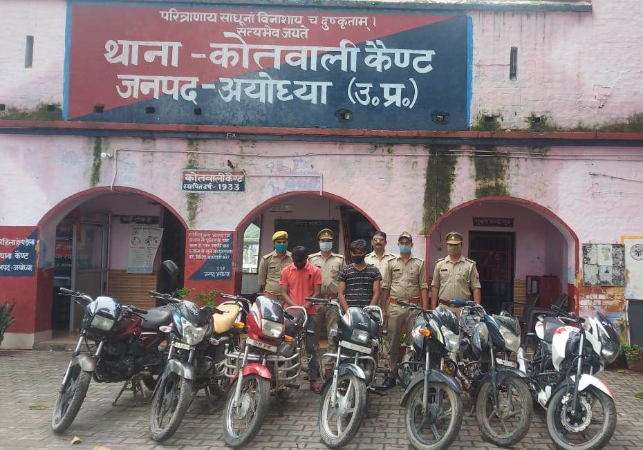 अयोध्या थाना कैण्ट पुलिस को अंतर्जनपदीय वाहन चोर गैंग का पर्दाफाश करने में बड़ी सफलता हाथ लगी है। पुलिस टीम ने दो वाहन चोरों को गिरफ्तार किया है। उनकी निशानदेही पर पुलिस ने सात मोटर साइकिल बरामद की है।एसपी सिटी विजयपाल सिंह ने बुधवार को कैंट थाने में वाहन चोर गैंग का खुलासा करते हुए बताया कि एसएसपी शैलेश पाण्डेय के निर्देश प्रभारी निरीक्षक अरुण प्रताप सिंह के नेतृत्व में पुलिस टीम को सफलता मिली है। उन्होंने बताया कि बुधवार को सहादतगंज बैरियर के पास से पुलिस टीम ने वाहन चोर गैंग के पूराकलन्दर थाना क्षेत्र के डाभासेमर निवासी सतीश कुमार पुत्र राममिलन एवं बस्ती जिले के कोतवाली नगर के चमरौहा सियरापारा निवासी शैलेश चौधरी पुत्र सदानन्द को गिरफ्तार किया गया। आरोपितों की निशानदेही पर विभिन्न थाना क्षेत्रों से चोरी की सात मोटरसाइकिल बरामद की गई है। उन्होंने बताया कि शैलेष चौधरी पर कई आपराधिक मामले दर्ज है। गिरफ्तार करने वाली पुलिस टीम में उपनिरीक्षक स्वतन्त्र कुमार मौर्य, अमित कुमार, शिवानन्द यादव, कांस्टेबिल ओम प्रकाश सिंह, धर्मेन्द्र कुमार, विशाल सरोज शामिल रहे।