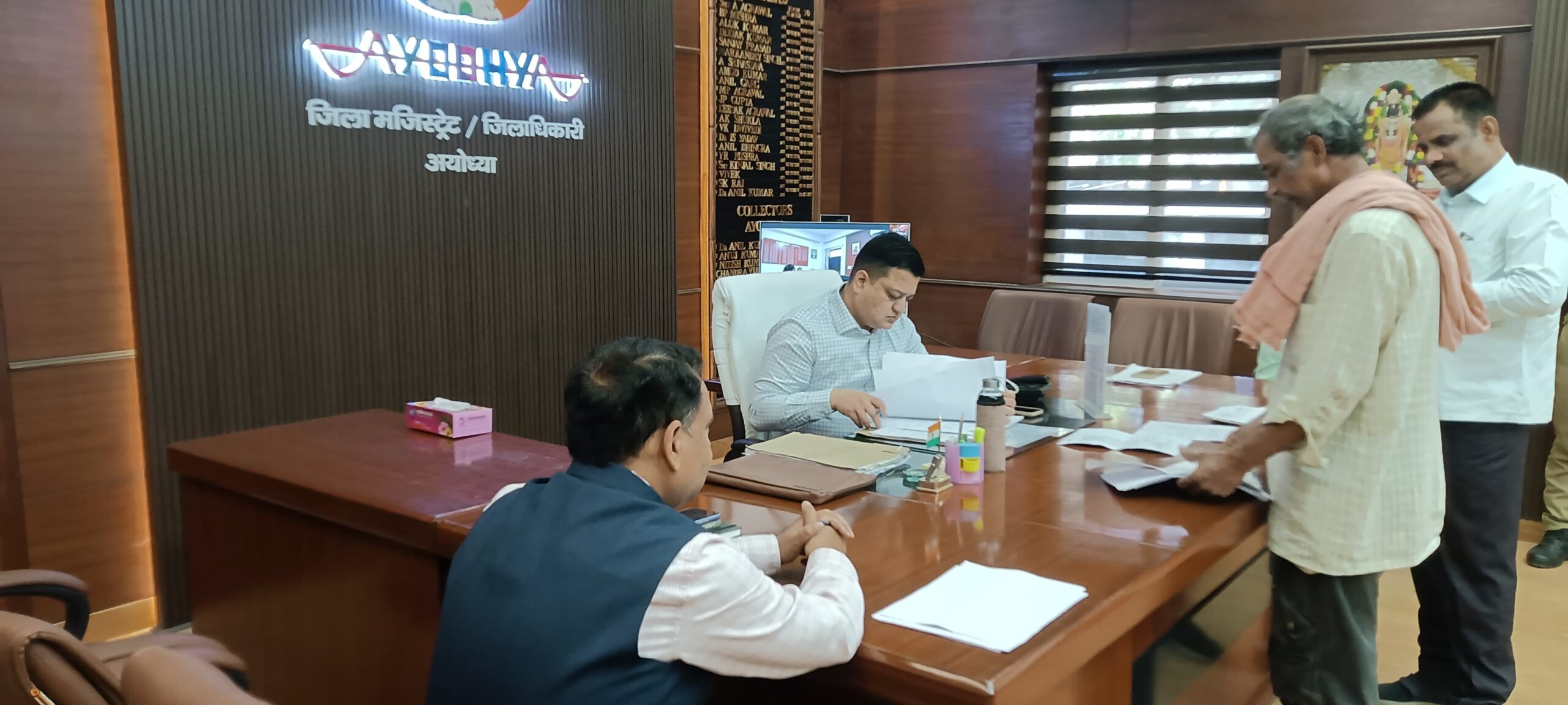 अयोध्या।डीएम निखिल टीकाराम फुंडे की अध्यक्षता में सोमवार को कलेक्ट्रेट कार्यालय में जनता दर्शन का आयोजन किया गया।जिसमें जिले के विभिन्न ग्रामों एवं शहरी क्षेत्रों से आए आम नागरिकों ने अपनी समस्याएं एवं शिकायतें जिलाधिकारी के सामने रखी।इस मौके पर डीएम ने प्राप्त शिकायतों को गंभीरता से सुनते हुए सम्बन्धित विभागीय अधिकारियों को तत्काल कार्यवाही करने के निर्देश दिए।उन्होंने कहा कि सभी विभाग यह सुनिश्चित करें कि जनता की समस्याओं का त्वरित एवं गुणवत्तापूर्ण समाधान किया जाए तथा शिकायतों के निस्तारण में लापरवाही न हो। जनता दर्शन में मुख्य रूप से भूमि विवाद, राजस्व संबंधित प्रकरण, पेंशन, विद्युत, जलापूर्ति, सड़क मरम्मत, स्वास्थ्य सुविधा तथा जनकल्याणकारी योजनाओं से संबंधित मुद्दे सामने आए। जिलाधिकारी ने अधिकारियों को निर्देशित किया कि प्रत्येक मामले की प्रगति की साप्ताहिक समीक्षा की जाए और शिकायतकर्ता को निस्तारण की जानकारी समय से उपलब्ध कराई जाए।