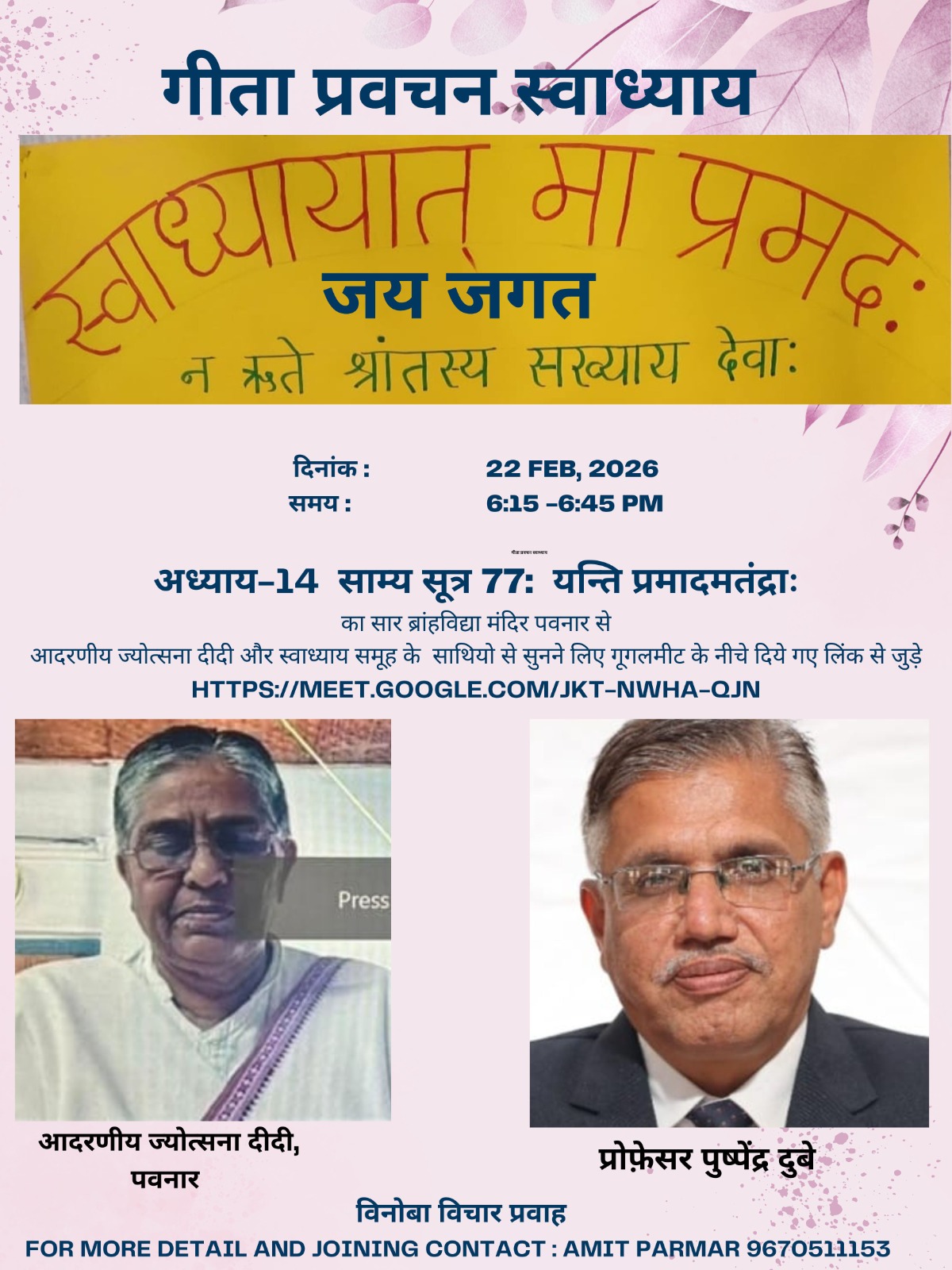 अमित परमार ने प्रोग्राम में जुड़े आदरणीय ज्योत्सना पटेल, पुष्प्रेंद्र जी, बिमलमुंडे जी,अनिल उपाध्याय जी, सीमा देशमुख, सत्रुधन झा, दीपिका उपाध्याय, दिलीप पवार, चतुरा रासकर, शिवम वाडा, डॉ. सुरेश गर्ग, हेमा ब्रह्मभट्ट, मनोज मीता पांडेय, क्रति शाह, उषा शर्मा, संदीप कुमार वर्मा, करूनेश राव, मनीषा, प्रोफेसर देवराज सिंह, आदरणीय रमेश भैया जी, बिमला दीदी, कुसुम जी, नाथूराम भाई, कविता जी, अलका प्रकाश पाण्डेय जी , आदरणीय सुरेश गर्ग और मनोज मीता जी, शिवाकान्त जी, ओमप्रकाश जी, वर्षा शाह जी, उषा शर्मा आदि सहभागियों को स्वाध्याय परिवार मे नियमित जुडने के लिए धन्यवाद ज्ञापित किया। साप्ताहिक स्वाध्याय प्रत्येक रविवार सायं 6:15 से 6:45 बजे ऑनलाइन आयोजित होता है स्वाध्याय से जुड़ने के लिए आप मोबाइल नंबर 9670511153 अथवा ईमेल amitparmar47@gmail.com के माध्यम से संपर्क कर सकते हैं।