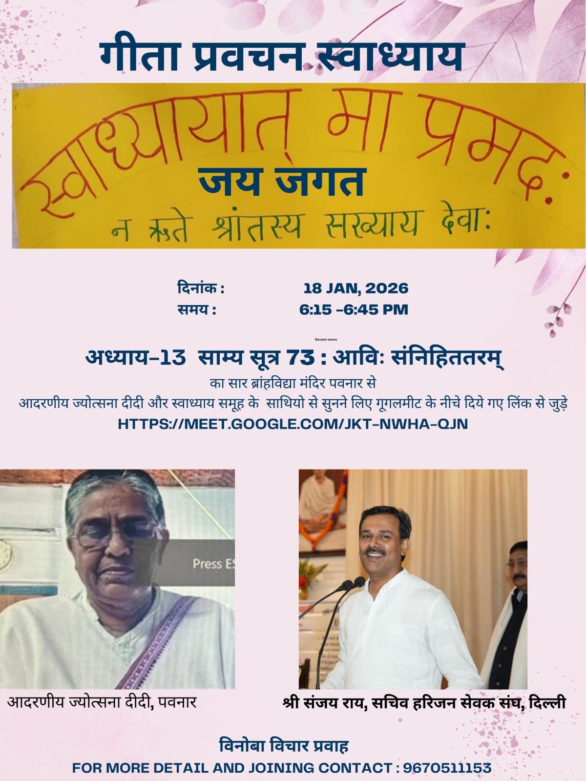 कार्यक्रम के अंत में सभी सहभागियों ने यह संकल्प लिया कि गीता के संदेश को केवल सुनने तक सीमित न रखकर, उसे दैनिक जीवन में आचरण में उतारा जाए। विनोबा विचार प्रवाह और विनोबा सेवा आश्रम के संस्थापक आदरणीय रमेश भैया जी ने सभी को धन्यवाद ज्ञापित किया और हरिजन सेवक संघ दिल्ली से आदरणीय उर्मिला दीदी ने स्वाध्याय समूह को सतत ये क्रम चलाए जाने के लिए बधाई दी और आगे से जुड़कर गीता स्वाध्याय में प्रतिभाग भी करेंगी |