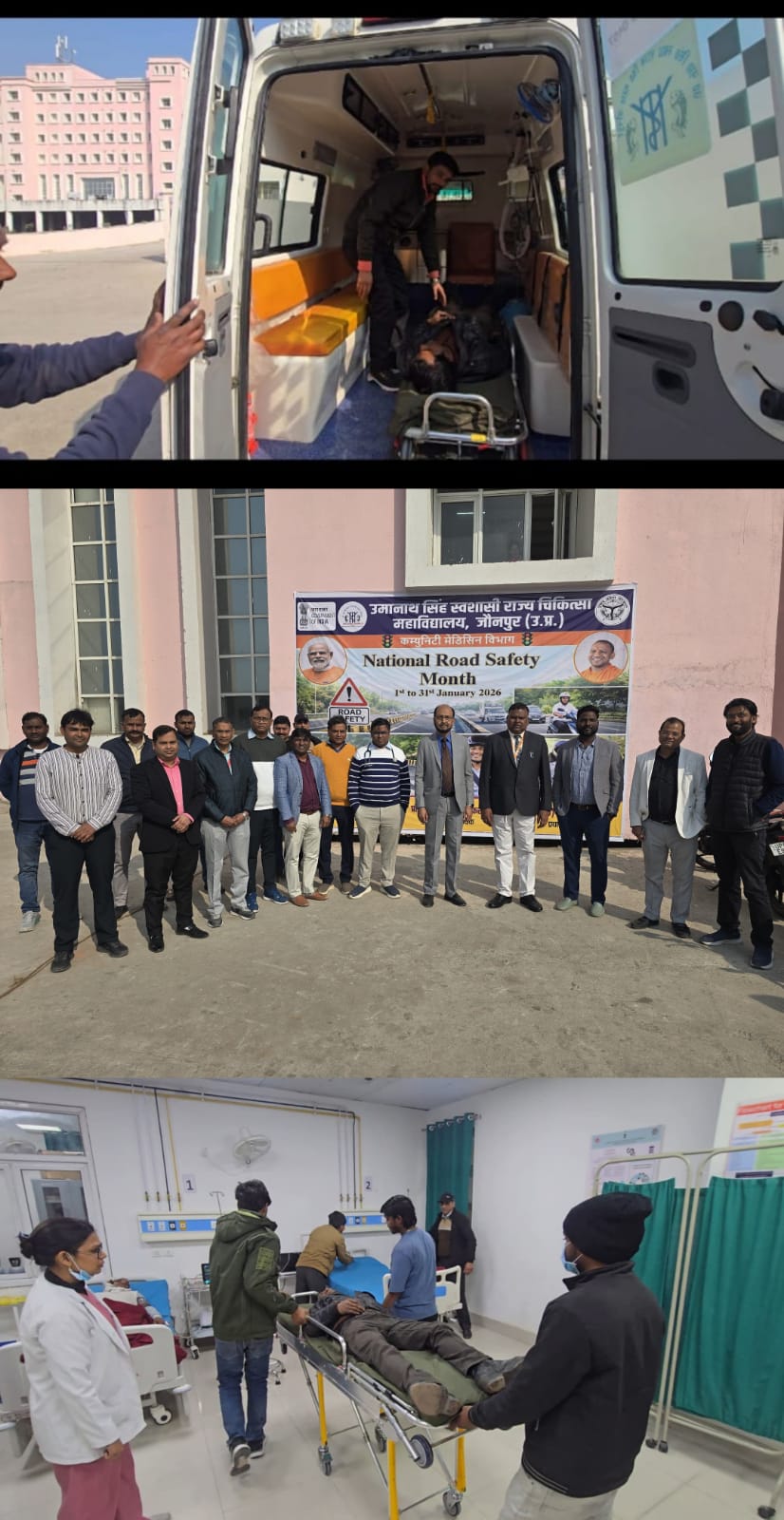 *जौनपुर:* उमानाथ सिंह स्वशासी राज्य चिकित्सा महाविद्यालय, जौनपुर के प्रधानाचार्य प्रो० आर०बी० के कुशल नेतृत्व में कम्युनिटी मेडिसिन विभाग के विभागाध्यक्ष, डा० मुदित चौहान के द्वारा आज राष्ट्रीय सड़क सुरक्षा माह (1 जनवरी से 31 जनवरी 2026) के अन्तर्गत आपातकालीन उपचार का मॉक ड्रील कराया गया। एएलएस (एडवांस्ड लाइफ सपोर्ट) एंबुलेंस के अंतर्गत कार्यरत इमरजेंसी मेडिकल टेक्निशियन (ईएमटी०) को रोड ट्रैफिक एक्सीडेंट (आरटीए) से घायल मरीज के त्वरित एवं प्रभावी उपचार हेतु एक व्यावहारिक मॉक ड्रिल का आयोजन किया गया। इस मॉक ड्रिल में दुर्घटना स्थल का वास्तविक परिदृश्य तैयार कर आपात स्थिति में अपनाई जाने वाली समस्त चिकित्सकीय एवं प्रबंधन प्रक्रियाओं का क्रमबद्ध अभ्यास कराया गया।