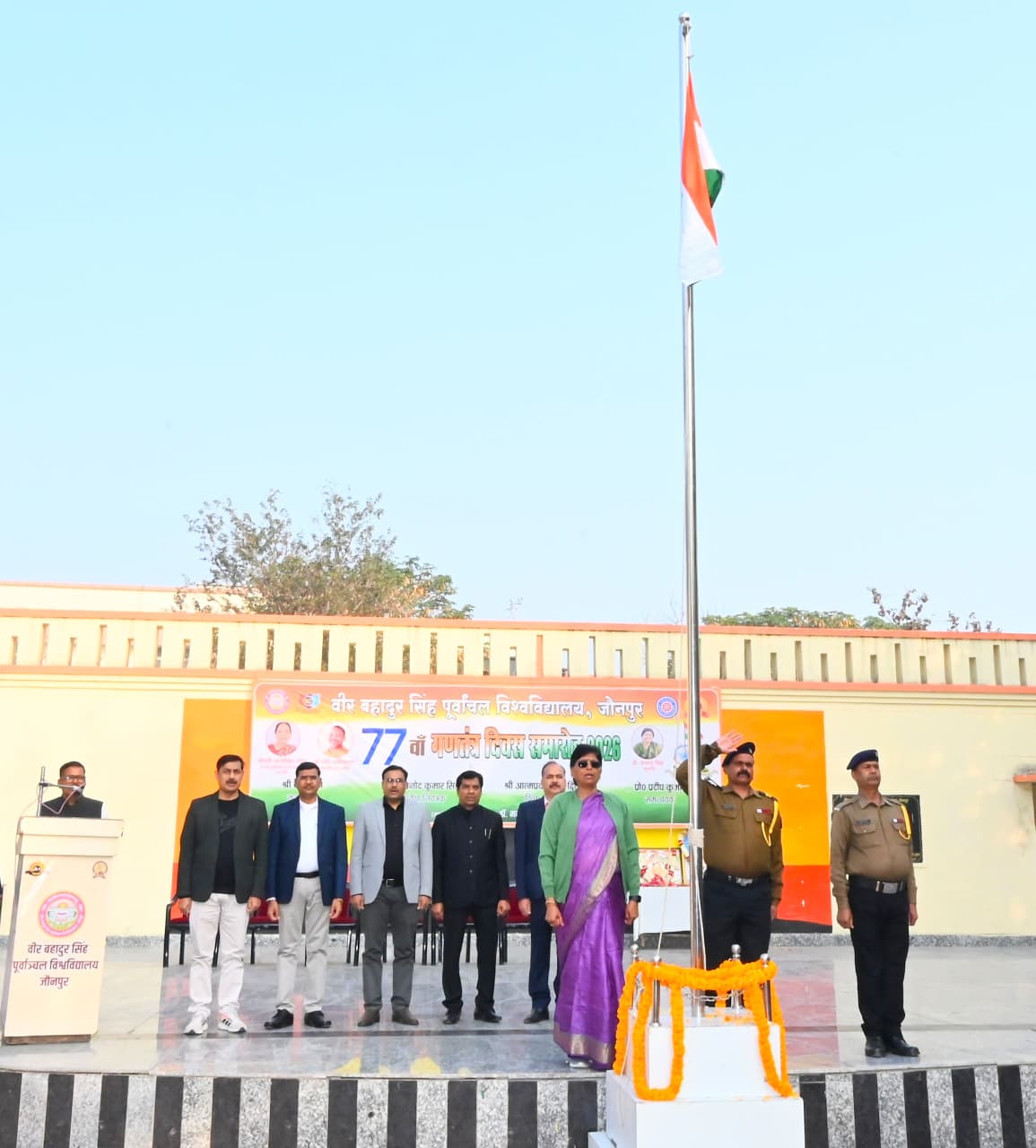 जौनपुर, । यूपी के जौनपुर स्थित वीर बहादुर सिंह पूर्वांचल विश्वविद्यालय में सोमवार को गणतंत्र दिवस समारोह पूरे हर्षोल्लास एवं गरिमा के साथ मनाया गया। विश्वविद्यालय के मुक्तांगन में कुलपति प्रो. वंदना सिंह ने ध्वजारोहण किया। इस अवसर पर विश्वविद्यालय की राष्ट्रीय कैडेट कोर (एनसीसी) के कैडेटों तथा पूर्व सैनिक सुरक्षा कर्मियों ने तिरंगे को सलामी दी।