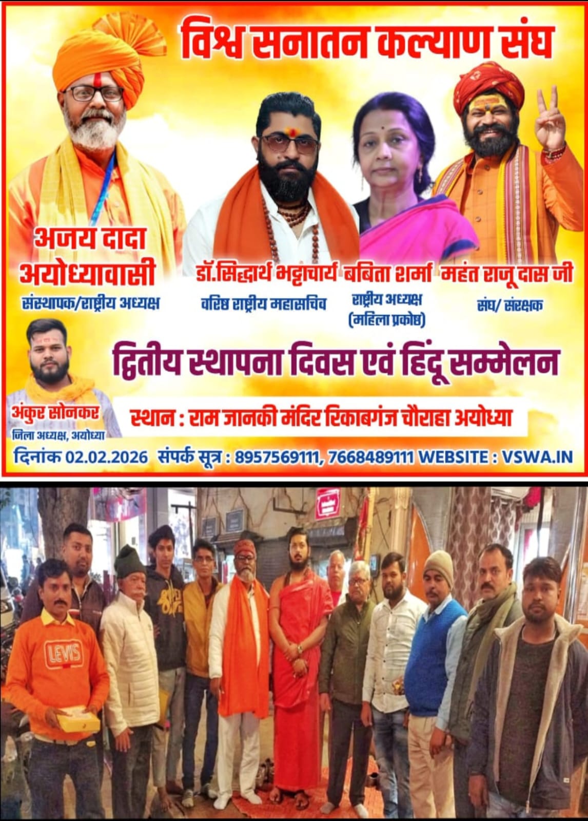 अयोध्या धाम (डीकेयू लाइव ब्यूरो चीफ) सुरेंद्र कुमार। विश्व सनातन कल्याण संघ का मुख्य उद्देश्य सनातन धर्म के शाश्वत मूल्यों की रक्षा, प्रचार-प्रसार एवं व्यावहारिक स्थापना के माध्यम से समाज में आध्यात्मिक, सांस्कृतिक एवं सामाजिक उत्थान लाना है। संघ एक सशक्त, आत्मनिर्भर एवं संस्कारित हिंदू समाज के निर्माण के संकल्प के साथ निरंतर कार्य कर रहा है। संघ के स्थापना दिवस के अवसर पर आयोजित कार्यक्रम में “गो रक्षा” जैसे गंभीर विषय पर अपने विचार रखते हुए संघ के संस्थापक एवं राष्ट्रीय अध्यक्ष अजय दादा अयोध्यावासी ने कहा कि गौ माता सनातन संस्कृति की आधारशिला हैं। उन्होंने कहा कि विश्व सनातन कल्याण संघ का एक प्रमुख उद्देश्य गो हत्या पर रोक, गो तस्करी के विरुद्ध जन-जागरूकता तथा गोवंश की रक्षा के लिए सामाजिक एवं प्रशासनिक स्तर पर सतत प्रयास करना है। उन्होंने यह भी स्पष्ट किया कि गौ माता केवल एक पशु नहीं, बल्कि मातृत्व और समृद्धि का प्रतीक हैं। संघ धार्मिक, सामाजिक एवं सांस्कृतिक अधिकारों की रक्षा के साथ-साथ युवाओं में धर्म, राष्ट्र और सेवा की भावना विकसित करने हेतु निरंतर सक्रिय है। संघ के वरिष्ठ राष्ट्रीय महासचिव डॉ. सिद्धार्थ भट्टाचार्य ने कहा कि “गो रक्षा” के साथ-साथ संघ “गो सेवा” को भी अपना पवित्र कर्तव्य मानता है। इसके अंतर्गत संघ की विभिन्न शाखाओं एवं सनातनी युवाओं द्वारा देश के अलग-अलग प्रदेशों में गोशालाओं की स्थापना एवं सहयोग, गो रक्षा कार्यों में पुलिस-प्रशासन के साथ समन्वय, तथा बीमार, वृद्ध एवं निराश्रित गौवंश की सेवा का कार्य निष्ठा से किया जा रहा है। उन्होंने कहा कि संघ का दृढ़ विश्वास है कि सटीक शिक्षा, संस्कार, नैतिक मूल्यों, धर्म ज्ञान और भारत के वास्तविक इतिहास का सम्यक ज्ञान ही समाज परिवर्तन की मजबूत नींव है। इसी उद्देश्य से आर्थिक रूप से कमजोर एवं वंचित वर्ग के बच्चों की शिक्षा में सहायता हेतु संघ निरंतर प्रयासरत है। संघ की महिला प्रकोष्ठ की अध्यक्ष मा. बविता शर्मा ने कहा कि प्राचीन मंदिर हमारी आध्यात्मिक, सांस्कृतिक एवं ऐतिहासिक धरोहर हैं। संघ का एक प्रमुख लक्ष्य जीर्ण-शीर्ण एवं उपेक्षित मंदिरों का जीर्णोद्धार, नियमित पूजा-पाठ एवं धार्मिक गतिविधियों की पुनः स्थापना करना है। उन्होंने कहा कि मंदिरों को सामाजिक एवं सांस्कृतिक केंद्र के रूप में विकसित किया जाना आवश्यक है, ताकि आने वाली पीढ़ियाँ अपनी जड़ों से जुड़ी रह सकें।