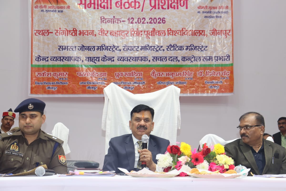 जौनपुर, 12 फरवरी। जिलाधिकारी डॉ. दिनेश चंद्र की अध्यक्षता में वीर बहादुर सिंह पूर्वांचल विश्वविद्यालय के संगोष्ठी भवन में गुरुवार को उत्तर प्रदेश माध्यमिक शिक्षा परिषद की हाईस्कूल एवं इंटरमीडिएट बोर्ड परीक्षा-2026 को सकुशल, निष्पक्ष, पारदर्शी एवं नकलविहीन ढंग से संपन्न कराने के उद्देश्य से समीक्षा बैठक एवं प्रशिक्षण कार्यक्रम आयोजित किया गया। बैठक में परीक्षा की तैयारियों की विस्तृत समीक्षा की गई और संबंधित अधिकारियों को आवश्यक दिशा-निर्देश दिए गए।