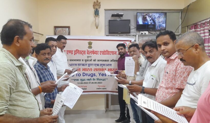 View More एक युद्ध नशे के विरूद्ध-नशे को ना कहें और जिंदगी को हाँ कहें‘‘ जौनपुर 23 जून 2023 (सू0वि0) – माननीय गृह मंत्री भारत सरकार के निर्देशों के क्रम में नशा मुक्त भारत अभियान के तहत एन0सी0बी0 द्वारा 12 जून 2023 से 26 जून 2023 तक ’’नशा मुक्त भारत पखवाड़ा’’ के अनुपालन में जिलाधिकारी महोदय जौनपुर एवं सहायक आयुक्त वाराणसी मण्डल, वाराणसी के निर्देशन में 23 जून 2023 को औषधि निरीक्षक ड्रग इंस्पेक्टर श्री चंद्रेश द्विवेदी ने दिवाकर मेडिकल स्टोर पर उपस्थित केमिस्ट एण्ड ड्रगिस्ट वेलफेयर एसोसिएशन जौनपुर के पदाधिकारियों को नशा मुक्ति हेतु शपथ दिलवाया, नशे के दुष्परिणाम के बारे सचेत किया, दवा दुकानदारों से अपील किया कि सही व्यक्ति को ही दवा की विक्री की जाय, चिकित्सक के परामर्श पर ही दवाओं की विक्री की जाय ताकि उसका दुरुपयोग न हो पाए। दवाओं के दूरूप्रयोग का परिणाम बहुत भयानक होता है। आज आम जनमानस के साथ साथ देश के युवाओं में नशीली दवाओं का दुरूप्रयोग बढ़ता जा रहा है, जो कि चिन्ता का विषय है। जागरूकता फैलाकर नशीली दवाओं का दुरूप्रयोग रोका जा सकता है। जिससे एक समृद्ध एवं स्वस्थ्य भारत का निर्माण हो सके। जिलाधिकारी महोदय जौनपुर के निर्देशों के क्रम में आगामी 26 जून 2023 तक जनपद जौनपुर के सभी व्यवसायियों से मिलकर जगह जगह जनसामान्य को नशा छोड़ने के लिए जागरूक करते हुए शपथ दिलायी जायेगी। कार्यक्रम में संस्था के संरक्षक श्री राजेश सिंह, चेयरमैन, अध्यक्ष श्री शकील अहमद, महा मंत्री श्री दिवाकर सिंह, मीडिया प्रभारी श्री संजीव सिंह, श्री अखिलेश श्रीवास्तव, कोषाध्यक्ष श्री बंशीधर मौर्य, उपाध्यक्ष श्री विनोद रावत,कार्यवाहक महामंत्री श्याम सिंह, सह मंत्री आनंद साहू,ऑडिटर सुनील गुप्ता, प्रशांत मौर्य, महेश पांडेय, विनय गुप्ता, अखिलेश प्रजापति आदि उपस्थित रहे। उक्त जानकारी औषधि निरीक्षक, खाद्य सुरक्षा एवं औषधि प्रशासन चन्द्रेश कुमार द्विवेदी ने दी हैCategory: राज्य