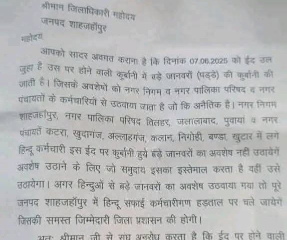 शाहजहांपुर उत्तर प्रदेश के हिंदू सफाई कर्मचारियों ने बकरीद पर दी जाने वाली कुर्बानी के कचरा अवशेष को साफ करने से किया इंकार शाहजहांपुर उत्तर…